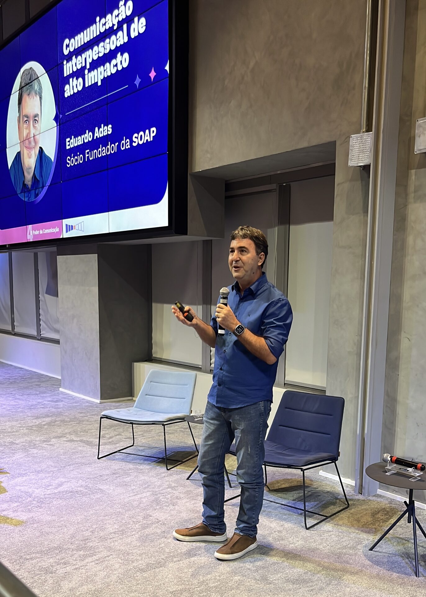 No campo visual, criamos uma identidade que destacava cada etapa do evento, facilitando ao participante a compreensão do momento de aprendizado em que se encontrava ao longo das palestras. Por fim, no palco, a SOAP contribuiu com conhecimento sobre comunicação interpessoal, representada por uma palestra inspiradora do Edu Adas.